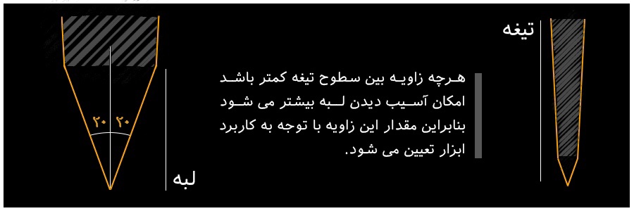 دیگر عامل مهم در کیفیت هر تیغهای زاویهی قرار گیری سطوح آن نسبت به یکدیگر است. البته باز هم نکتهی مهم داشتن زاویهی مناسب است و نه زیاد یا کم. ضخامت لبه، حاصل زاویهی قرار گیری دو سطح نسبت به یکدیگر است و هر چه این زاویه بیشتر باشد ضخامت لبه بیشتر خواهد بود. در این باره توجه به این نکته که ضخامت لبه و ضخامت تیغه دو مقدار مجزا از هماند ضروریست (به شکل زیر توجه کنید). ضخامت بیشتر لبه موجب کاهش توانایی آن در بریدن خواهد شد و تیغه برای بریدن نیازمند قدرت بیشتر در برخوردها می باشد. چنین تیغههایی دوام زیادی دارند و در ابزارهایی چون تبر شاهد چنین ضخامتی در نواحی بسیار نزدیک به لبه هستیم. تیغهایی که پیشتر به آنها اشاره شد ضخامت لبهی بسیار کمی دارند و زاویهی بین سطوح لبه از ١۵ درجه تجاوز نمیکند. چنین لبهای بسیار تیز و البته آسیب پذیر خواهد بود اما از آنجایی که میدانیم کاربرد این ابزار چیست، نگرانی بابت آسیب دیدن آن پیش نمیآید. چاقوهای آشپزخانه نیز بسته به کاربردشان (گوشت ٣٠ درجه- سبزیجات ۴٠ درجه) زوایای خاص خود را دارند. شمشیرها اما با توجه به کاربردی که دارند نیازمند ضخامت بالایی خواهند بود زیرا حریفشان همیشه پوشالی نیست! آهنگران ژاپنی در زمانهای متفاوت ضخامتهای متفاوتی برای لبهی سلاحهایشان انتخاب میکردند تا بتوانند از پس زره دشمن بر آیند. به طور کلی شمشیرهای ضخیمتر برای مبارزه با دشمنی که زره بر تن کرده بود مناسب بودند، در حالی که برای حمله های سریع به حریفی که کیمونو پوشیده بود شمشیرهای نازک و سبک عالی عمل می کردند.
