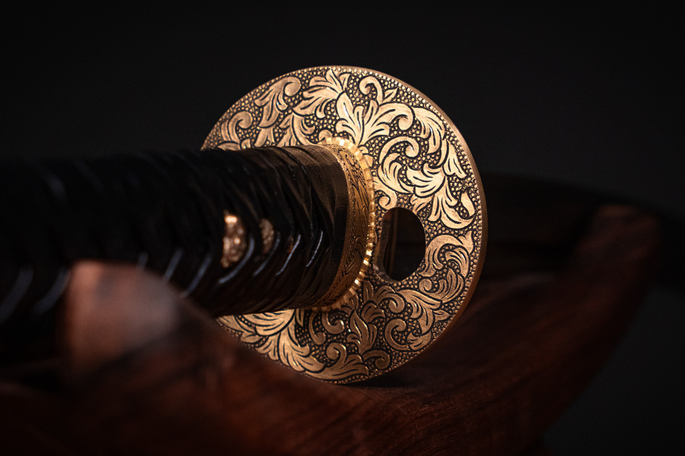 دستهی این کاتانا، با هستهای از چوب طبیعی و روکشی از چرم بافتهشده به روش سنتی ژاپنی، حس اصالت و استواری را منتقل میکند. هیچ قطعهای از پلاستیک در ساخت آن به کار نرفته، که نشاندهندهی تعهد به حفظ ریشههای کهن است. تزئینات فلزی روی تسوبا، فوچی، کاشیرا و انتهای دسته، با پرداخت دستی و رنگآمیزی هماهنگ، به زیبایی آن میافزاید و هویت این شمشیر را تکمیل میکند.