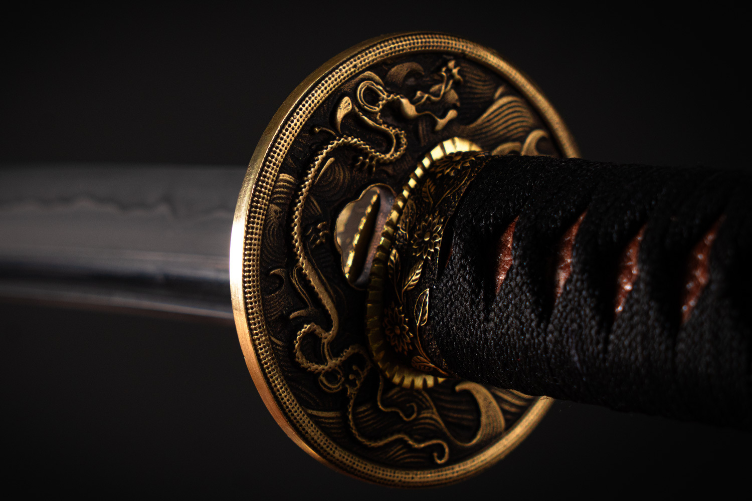 تسوبا (محافظ بین تیغه و دسته) از برنج تراشخورده ساخته شده و طرح برجستهی اژدها روی آن با روش ریختهگری سنتی اجرا شده است. تضاد میان سطح مات و خطوط طلایی، به شمشیر جلوهای اصیل و درعینحال لوکس میدهد. این جزئیات نه تزئین اضافی، بلکه بخشی از شخصیت Tsukuyo هستند.