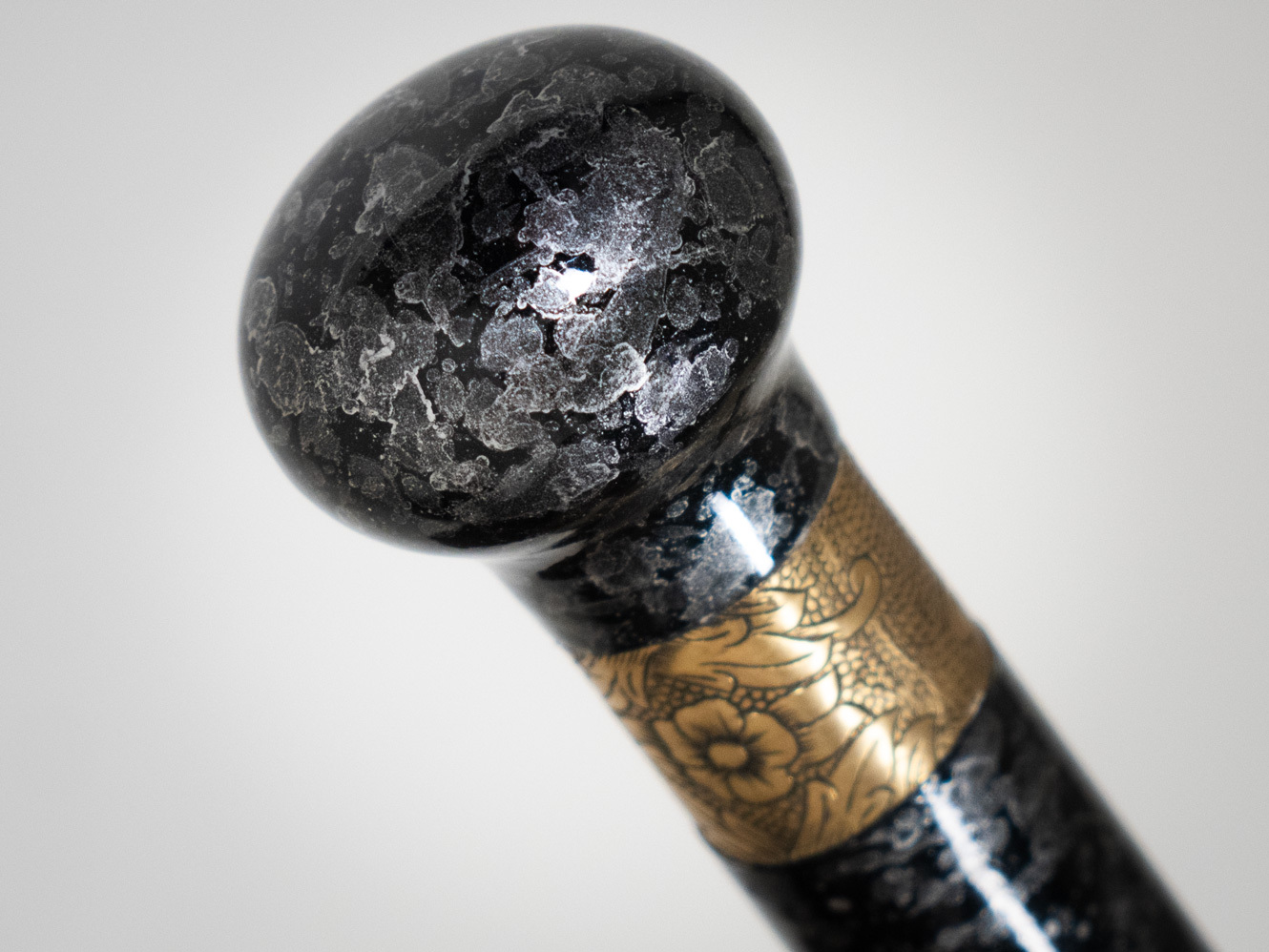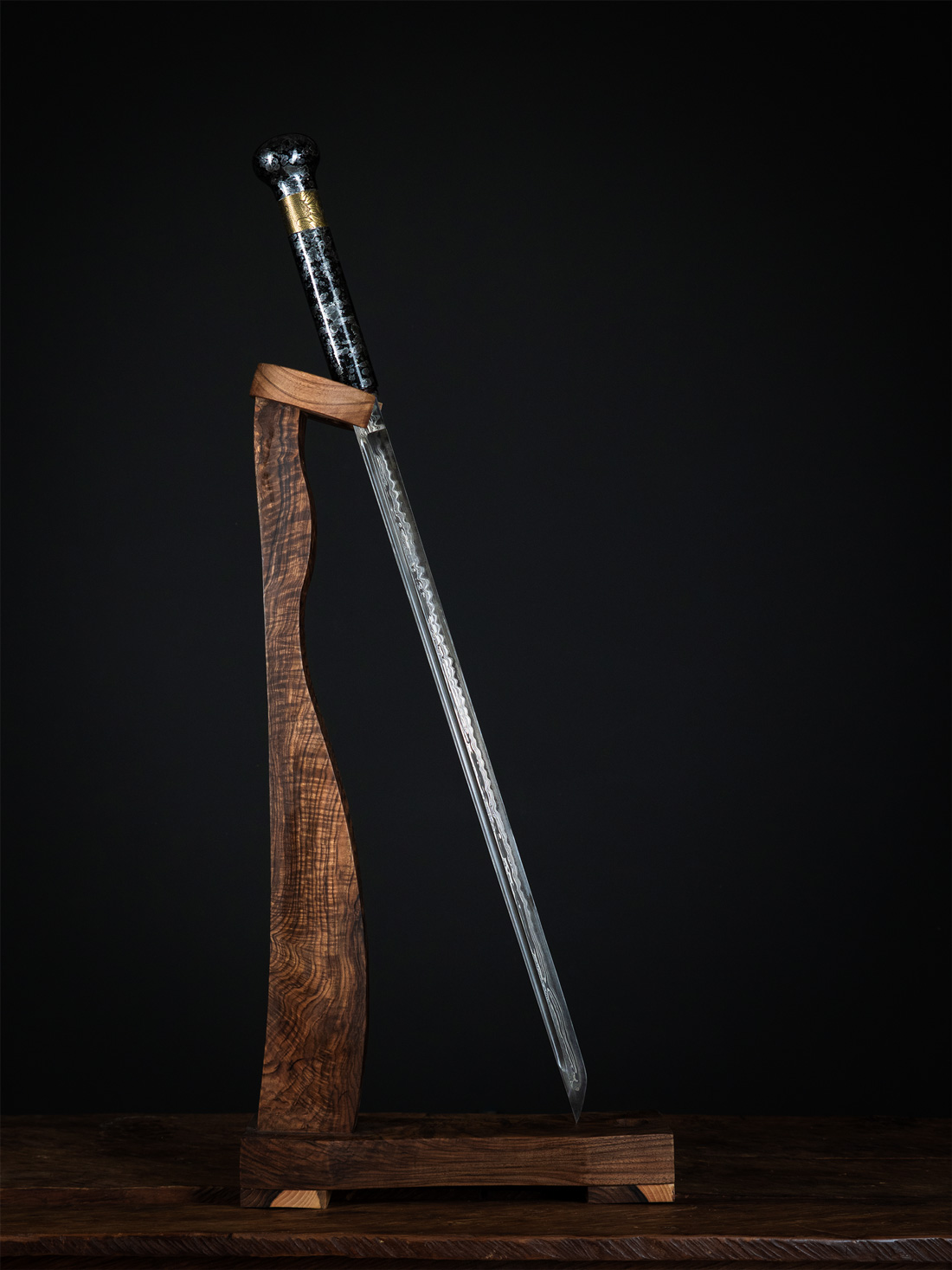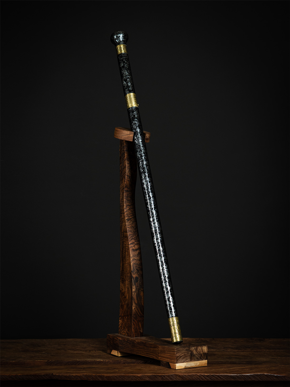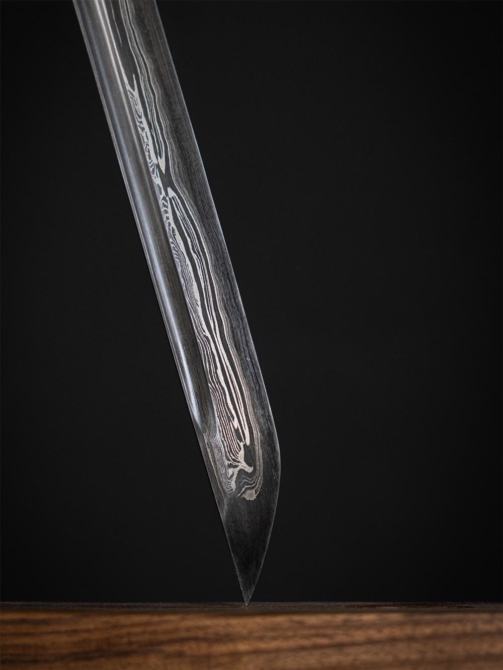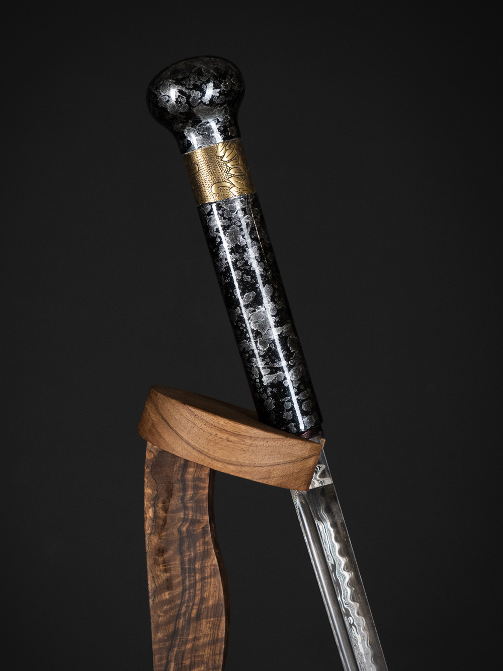 غلاف از چوب گردو انتخاب شده؛ چوبی با بافت متراکم، سنگین و مقاوم که در عین سادگی، وقار طبیعی دارد. سطح چوب با روغن طبیعی پوشیده شده تا در گذر زمان تیرهتر و زندهتر شود. بخشهای فلزی با قلمزنی دستی مزین شدهاند، الگویی که میان نقشهای سنتی ایرانی و ظرافت ژاپنی تعادل ایجاد میکند. هیچ بخش از این شمشیر ماشینی نیست؛ هر برش و هر پرداخت با دست انجام شده تا نتیجهی نهایی حس یک اثر هنری زنده را منتقل کند، نه صرفاً یک ابزار.